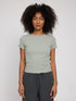 Feminin interpretiertes Basic T-Shirt mit feinen Details: Die gekräuselten Babylock-Ziernähte an Saum und Ärmeln verleihen dem Shirt eine zarte, verspielte Note. Der elastische Rippstoff sorgt für eine körpernahe Passform und hohen Tragekomfort – perfekt für Alltag und Layering.